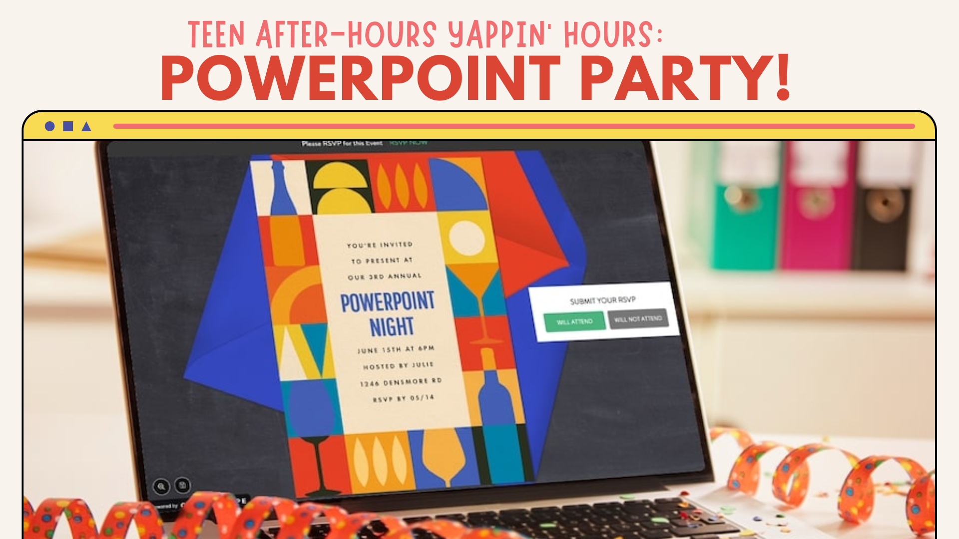 Calling all students in grades 6-12 who love to yap about anything and everything! The Library is hosting an after-hours powerpoint party for teens! You’ll have 30 minutes and free use of the library’s iPads to craft a brilliant slideshow presentation on the topic of your choice. Then, each participant will get 5 minutes to present their slideshow to a captive audience. Pizza and refreshments will be provided!