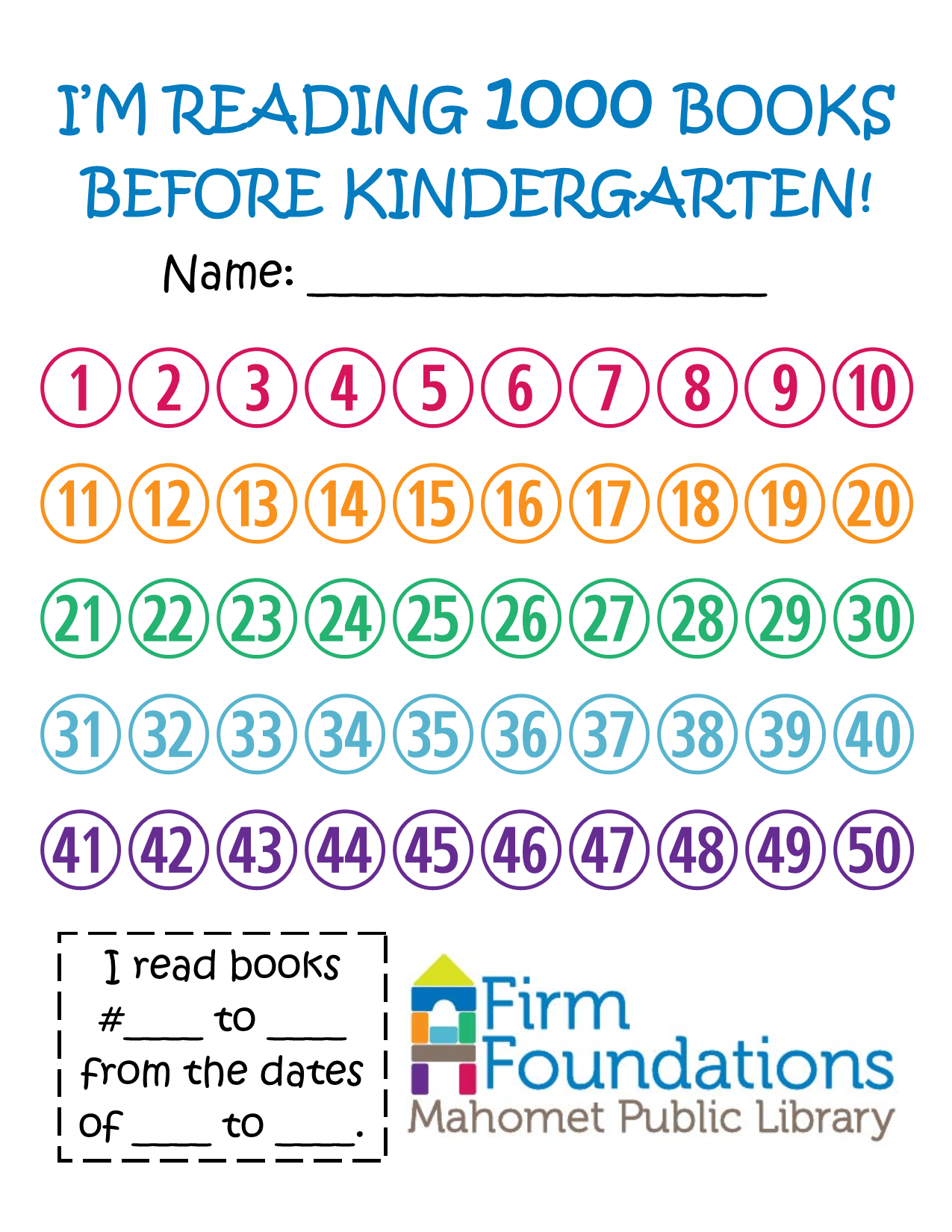 - Keep track of the books you and your child read together using the 1000 Books Before Kindergarten Reading Log (repeat readings count!).